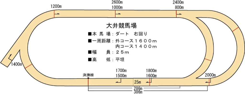 まず大井競馬場の特徴から。南関東4場の中で唯一の右回り競馬場。2000mコースはスタートが直線奥で、広い外回りを使用することから、他の南関競馬場とは違ってコースの半分以上が直線となる。