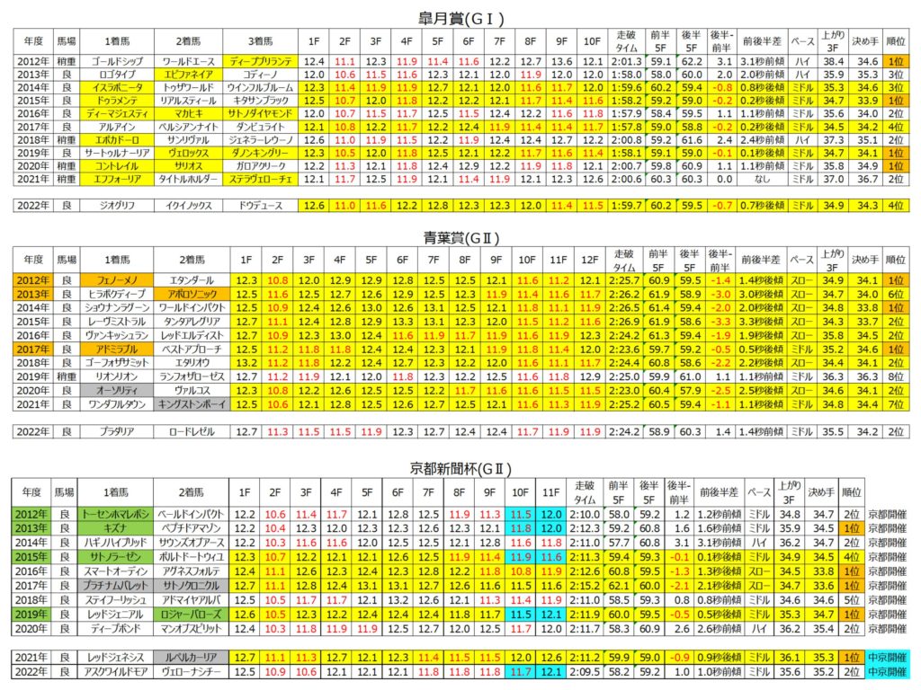 下記は近10年の皐月賞(GⅠ)、青葉賞(GⅡ)、京都新聞杯(GⅡ)の走破タイムと1F毎のラップを並べて表にしたものだ。