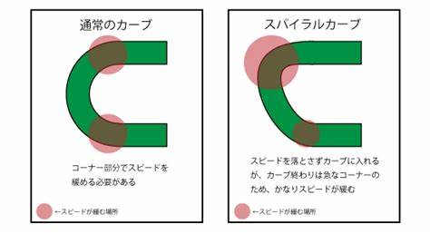 ※スパイラルカーブ:入口から出口にかけて半径が小さくなる複合曲線によって構成されるコーナーのこと。福島競馬場の芝コースでは進入時(3コーナー)の半径は大きくカーブが緩やか(下図右側の下の部分)なためスピードを落とさずに進入出来るが、4コーナーにかけてカーブが急で半径が小さくなる(下図右側上の部分)ため、最後の直線に出た際に遠心力で外に振られて馬群がばらけやすい。
