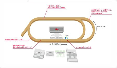 ・下記コース図参照。唯一の左回りコースで最後の300mの直線で加速力が求められる。