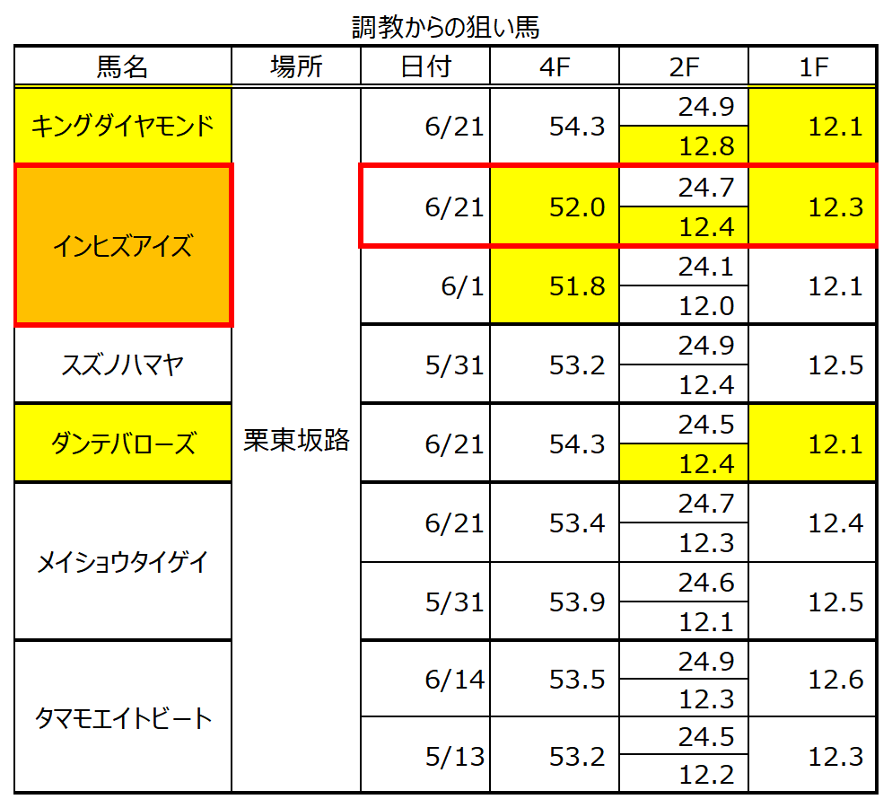 注目は④インヒズアイズ。1週前、当週と2週続けて52.0秒を切ってきた。更に6/21は2F→1Fが12.4→12.3の加速ラップ。文句なしのNo.1評価だ。その他⑭キングダイヤモンド、⑬ダンテバローズも全体時計は54秒台ながら2Fが24秒台で加速ラップを踏んでおり要注意。また、③メイショウタイゲイと⑥タマモエイトビートも24秒台を2回出しており侮れない。一方①スズノハマヤは24秒台をマークしたのが5/31と1ヶ月も前なので割引が必要だ。