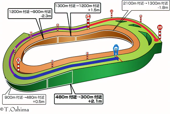 ・芝スタートで且つ内枠と外枠とで芝を走る距離が異なる(外は約30m長い)ため外枠有利。