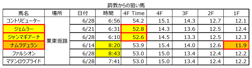 上記表から、2F24.5秒且つラスト1F11秒台で加速ラップを踏んでいる⑫ナムラデュラン。次に4Fのタイムが上から1番目・2番目の⑭ジャンマギアーナと⑯ジェムラーを重視。尚、調教時間を書いたのは、あまり馬が走っていない6時台の時計と馬場が荒れた後の8時台の時計では、同タイムでもその価値が大きく異なるからだ。その意味では⑮ファルシオンもよく走っている。