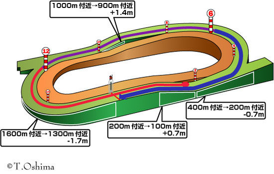 ・枠順は内枠が若干有利で逃げ・先行馬が内枠を引くと大きなアドバンテージになる。