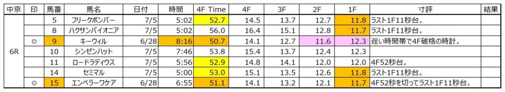 ⑨キーウィルは8:16と遅い時間帯で馬場が荒れている中、4F50.7秒と破格の時計。ラスト2F24.0秒台の馬を調教がよかった馬としてピックアップしているが、この馬は何と23.9秒と24.0秒を切って来た。最後は加速ラップとはいかずチグハグラップとなってしまったが、10:05現在で単勝185.4倍なら単・複で遊んでみたい。