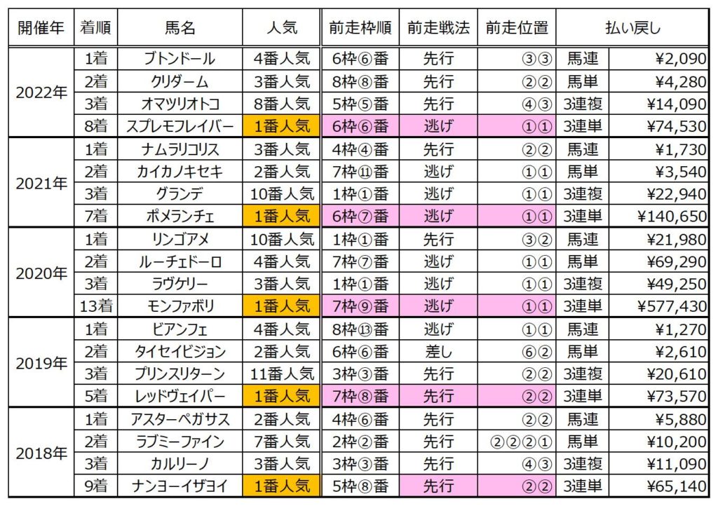 下表をご覧頂きたい。近5年1番人気馬が全て飛んでいる。その原因を探るべく前走の枠順と戦法を確認したところ、ある共通点があった。真ん中より外枠に入って、逃げ・もしくは先行して勝ち上がってきているのだ。