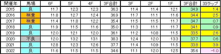 このレースはいちょうステークスからサウジアラビアロイヤルカップ(GⅢ)に昇格した2015年以降、昨年を除く7年全てで6Fの前半と後半の差が後半の方が速いという瞬発力勝負となっている。※下記表参照