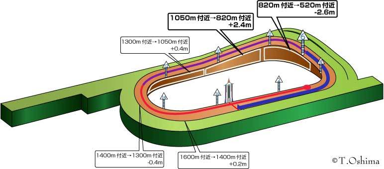 ・全てのクラスで前傾ラップになる。特にOP・重賞では前半3Fが36.4秒に対し後半3Fが37.4秒と1秒遅い。