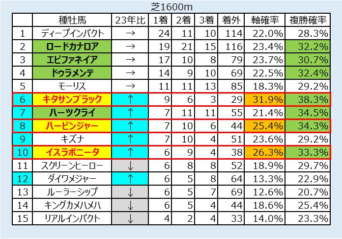 そこで、種牡馬ランクの上位から該当馬を探るとエピファネイア産駒が2頭出走しているので、持ち指数順に本命を③コンテネレッツア、対抗を⑧ニシノシャミナードとした。