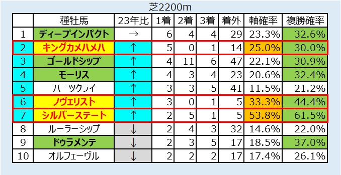 ・ゴールドシップ、ノヴェリスト、ドゥラメンテも狙えるが、特筆すべきはシルバーステート。連対率、複勝率は文句なし。出ていたら狙いたい。