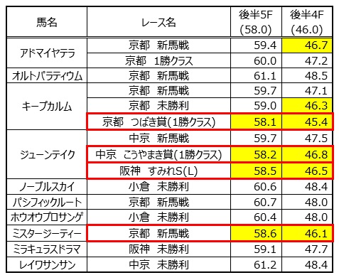 出走馬が連対した時の後半5Fと4Fのタイムをまとめたのが下の表になる。