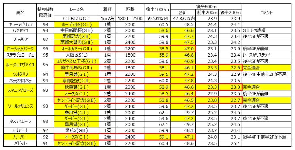 上記条件に完全に一致しているのが⑬ルージュエヴァイユの府中牝馬S(GⅡ)と⑤スタニングローズの秋華賞(GⅠ)、⑩ソールオリエンスのセントライト記念(GⅡ)。この中で持ち指数が1番高く、且つエリザベス女王杯でも後半5Fが0.1秒だけ届かず準一致した⑬ルージュエヴァイユ本命。
