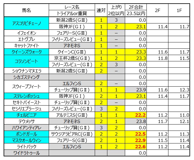 何故上がり3Fのタイムではなく2Fのタイムなのか?というと、桜花賞は後半4Fのうち最後の1Fが急坂のため平均で0.5秒も失速する傾向にあり、後半4Fを速く走れて尚且つ後半2Fで平均より速く上がれる馬こそが突き抜けてくるためだ。具体的には後半2Fの平均が23秒49なので、23秒5以内で上がれる馬がいい。またトライアルもしくは重賞で出したラップで、且つ連対していた場合に絞る。