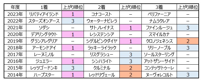 次に相手だが、桜花賞の近10年の傾向を見るとレースの上がり3Fの脚が3位以内に入った馬が7勝、2着6回、3着4回となっており、30頭の馬券圏内馬のうち実に半分の15頭が該当している。※下の左側の表参照