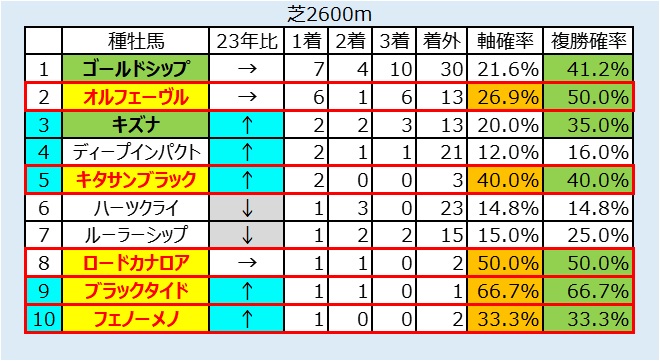 また、京都芝1800m外回りは重賞でも中盤が緩むロングスパート勝負になりやすく、上がり3位以内同士で決まる確率が高い。馬場が稍重までならこの傾向はそのままになる可能性が高く、上がり3位以内の脚が使える馬を中心視。