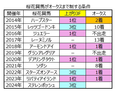 尚、14年のハープスターは終始最後方に位置し、最後の直線での仕掛けも遅れ、猛然と追い込んだものの、勝ち馬ヌーヴォレコルトのクビ差2着だったので、上がり最速で桜花賞馬になった馬はオークスではほぼアタマ固定出来ると考えている。