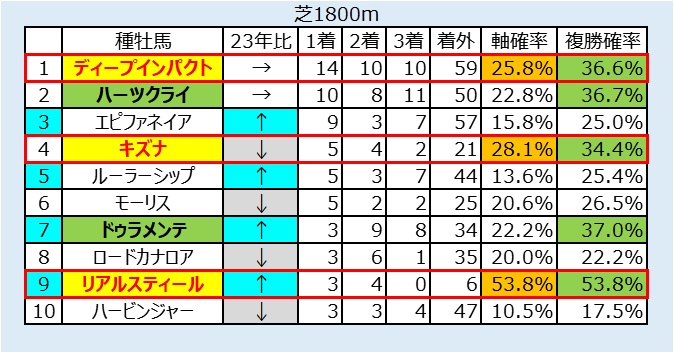 芝1400m~1800mでのD指数で60以上は72⑥エポックヴィーナス、同⑭ルカン、70⑤ルージュスエルテ、68④アルゲンテウス、64⑱ケイデンシーマーク、61⑨クロニクルノヴァ。