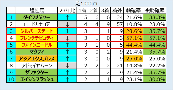 ・芝・ダート兼用血統が強く、実際にダートから転戦してきた逃げ、先行馬が穴をあけるケースが目立つ。