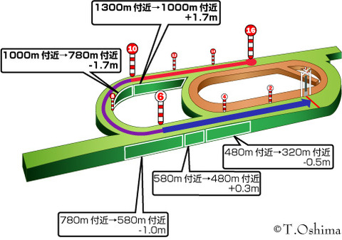 ・仕掛けのタイミングは最後の直線に入ってからでも十分に間に合うため、逃げ馬にとって非常に厳しいコース。