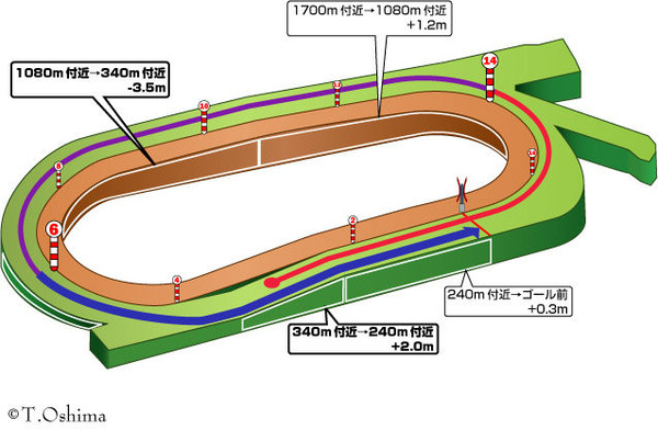 中京芝2000mは最後の直線の坂途中からスタートするため前半のラップは速くなりにくい。また、向こう正面のラスト1200mから下り坂が続く上に最後の直線も長いため、ロングスパート(コーナーで加速出来る能力)+瞬発力のある馬なら差し切りも可能。前走3コーナーで10番手以内で上がり3位以内の脚を使える馬を積極的に狙っていきたい。