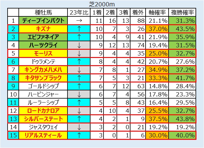 距離延長してきたキズナを狙う条件1~3番人気は連軸で、7番人気以下はヒモ穴で狙うべし。