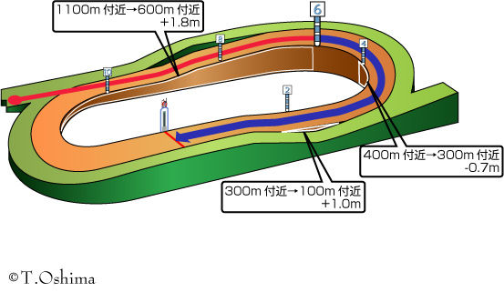・開幕週ならば内枠の逃げ~先行馬が明らかに有利、開催が進み馬場の内側が悪くなれば外枠の逃げ~先行馬と差し馬が有利という傾向が出てきやすい。