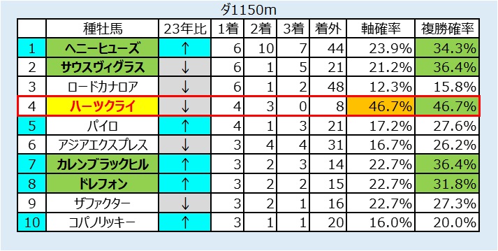 ・前走1~4着及び初出走のヘニーヒューズを狙う条件。ただし取りこぼしが多いので軸として。