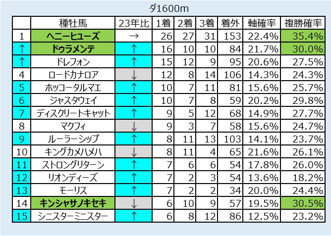 芝スタートとなるダート1600mで、最初の2Fは平均23秒25と芝レースなみの速さ。そのまま向こう正面を走るコースでコーナーまで距離が長いためスピードが落ちづらく、ハイペースになる。従って断然差し脚質が有利となるが、ダート戦なので速い上がりの脚を持っている馬でも位置取りが重要。理想は4コーナーで7番手以内だ。スピードの絶対値がモノを言うレースなので、7歳以上の高齢馬にはキツイ。またコース実績のある馬が馬券圏内に来る。