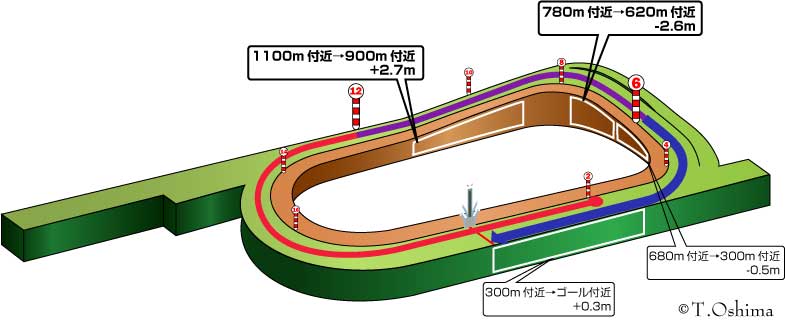 ・3コーナーに高低差3.1mの坂があり、下りの勢いがついた状態で直線に入るため、馬が外に振られて馬群がバラけやすい。その為、小回りコースの割に差しが良く決まる。