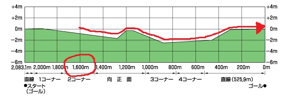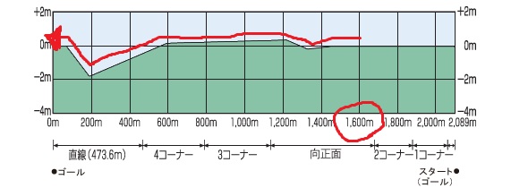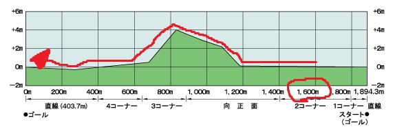 阪神・東京は回りこそ逆だが、スタートしてからほぼ平坦(阪神は最後は急坂)なのに対して、中京はほぼ平坦で3F過ぎからはずっと坂を下って最後に急坂というレイアウト。では京都は?というと、スタートして400m(2F)で4m坂を上った後、急激に下ってそのままゴールという形。