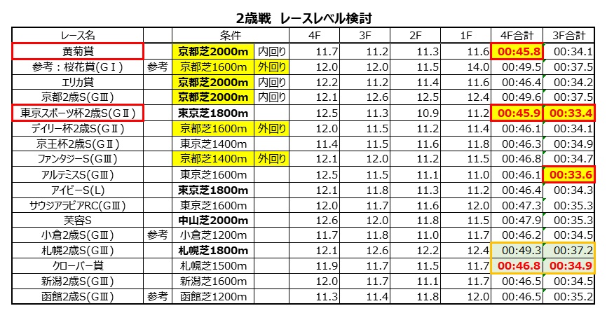 本命は全3項目に該当した④ミュージアムマイルとする。この馬の強調点は何と言っても前走黄菊賞の内容で、上がり4Fが45.8秒(11.7-11.2-11.3-11.6)。これがどれだけ凄いのかは、他のレースの上がりと比較するとわかる。下表を見て欲しい。