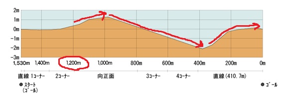 ダート1200mの中で中山ダート1200mと似ているコースは、回りは逆だが中京ダート1200m。上の比較図を見て頂きたいが、中京が1mほど上ってから下るという違いこそあれ、基本的にはずっと下って最後に急坂があるというレイアウトが中山と相似関係にある。