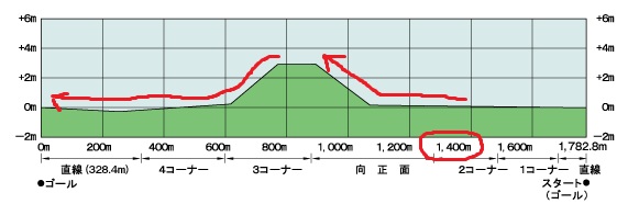 ・芝1200mよりスタート地点を後ろに200m下げたコース形態。最初のコーナーまでの距離が長くなる(516m)ことで先行争いが激化⇒差し有利