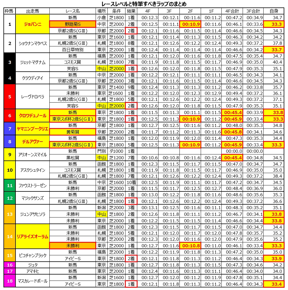 また、野路菊Sで最後の2F→1Fの区間で10秒台の速い流れを経験、3F33.6秒の流れの中、それを上回る33.3秒で上がり2着に入った①ジョバンニも面白い存在だ。