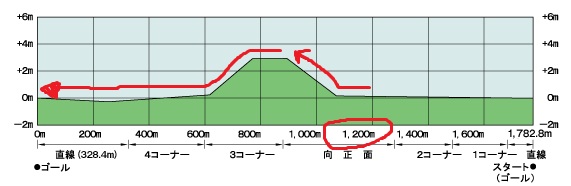 ⇒最初のコーナーまでの距離(316m)が短い+3角が上り坂+直線平坦⇒スローペースになりがち
