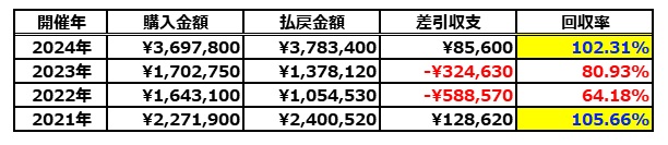 一時期のプラス¥770,000に比べると勝ち金額は大きく減ってしまったが、これも勉強料。結果プラスで終われて2年振りにプラスに出来たことをまずは喜びたい。その上で、来年に向けての反省もきちんとすべきだ。