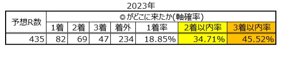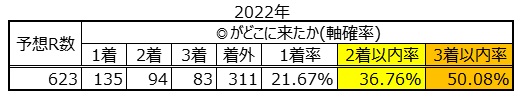 ※ちなみに、2022年の1着率は21.67%、2着以内率は36.76%、3着以内率は50.08%だった。下表参照。