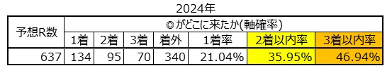 さて、では最後に、昨年暮れのその他の目標についても結果をおさらいしておきたい。年間を通してのプラス収支の他に、2024年は2022年の1着率、2着以内率、3着以内率を超えるという目標を持っていた。