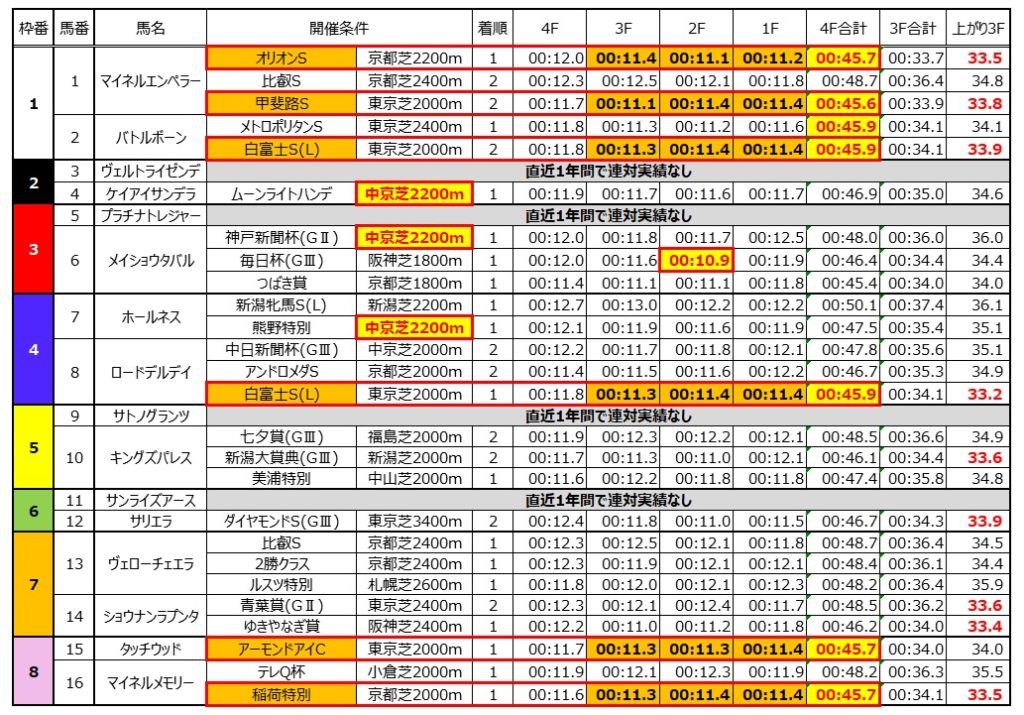 ⑥メイショウタバルは昨年の神戸新聞杯(GⅡ)で⑭ショウナンラプンタと同斤量で出走して1.6秒差は圧勝だったが、今は時計がかかる上に⑥メイショウタバルが57.0kg→57.5kg(+0.5kg)に対し⑭ショウナンラプンタは57.0→56.0kg(▲1.0kg)で1.5kgの負担重量差で差し馬場とくれば、逆転される可能性がかなり高いと見て評価を下げたい。更に②バトルボーンや④ケイアイサンデラの圧を受けて楽逃げが出来ない展開なら、人気のここは消しの一手だ。