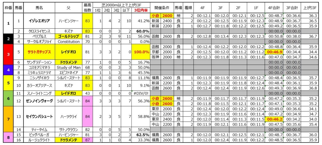 小倉芝2600mは大きく荒れる(配当がつく)ことが多く好きな条件。理由はシンプルで下級条件(1勝・2勝クラス)でしか開催されない上、長距離でスタミナ勝負になる割に、上がり3位以内の馬が馬券圏内に来るので難解なためだ。指数関係なく適性条件が合う馬が来ると思って買うのがベスト。私はシンプルに過去の上がり3位以内率と血統を参考に狙っている。