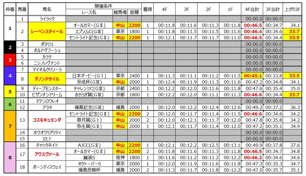 まず、下表を見て欲しい。出走馬の昨年連対したレースと、上がり4Fのラップタイムをまとめたものだ。上がり4Fにした理由は、このレースが向正面から加速する超ロングスパート戦になるからで、平均ラップは前半5Fが61秒台で後半5Fが59秒台、その時の4Fが47.22秒なので、少なくとも上がり4Fが47秒を切るレースで連対していることが望ましい。
