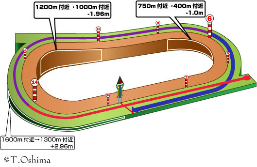 ・4コーナーのポケットからスタートし、最初のコーナーまで471.5mと距離が十分あるおかげで先行争いが激しくなりやすい。