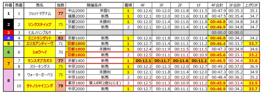 これを見ると、上がり4Fの高速持続力を求められたレースが⑥ショウヘイが出走した新馬戦と⑩サトノシャイニングが出走した東スポ杯2歳S(GⅡ)の2レースのみで共に45秒台。ここを両馬とも33秒台の脚で差して来ており、勝ち切れなかったものの連は確保。非常に優秀な成績だ。特に後者は重賞での内容でもあり、比較して上位に取りたい。