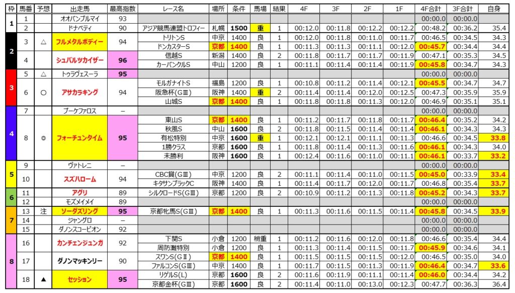 相手は単騎逃げ濃厚で、昨年のこのレース(阪神開催)を重馬場で2着に粘った⑥アサカラキングと、2走前のリゲルS(L)の4Fが優秀な⑱セッションを大穴で推す。