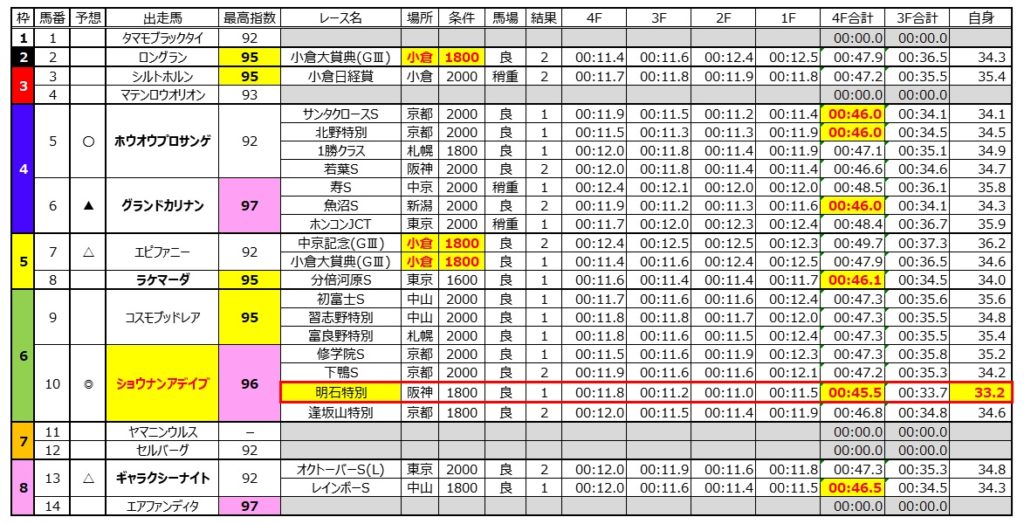 最近の予想の元データになっているのが、下記の表。当該レースに出走する馬の過去1年間で連対したレースを抜き出し、レースの上がり4Fと3F及び自身の上がり3Fのラップをまとめたものだ。瞬発力を要求されるレースは3Fを、スピードの持続力を要求されるレースは4Fを見て、ラップの速いレベルの高いレースで連対した馬、速い上がりを使えた馬に焦点を当てる。