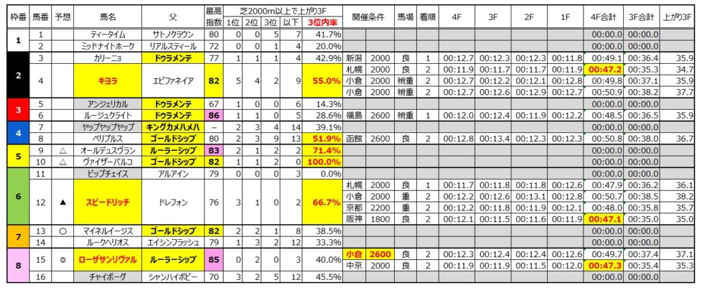 毎回言うことだが、小倉芝2600mは穴狙いでOKな条件。しかもわかりやすいことにレースでの上がり3Fで3位以内に入った馬が必ず馬券内に来る。この2つを使って今回も特選レースを当てたい。
