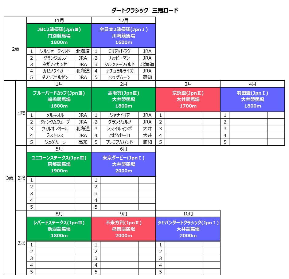 今年の3歳世代のダートクラシック三冠ロードの途中経過(成績)を下表にまとめてみた。無敗で全日本2歳優駿(JpnⅠ)を制したミリアッドラヴ(牝馬・JRA)は次走にサウジダービーを選択し7着。それから1ヶ月余り・・・このレースに出走登録はない。次走はどこになるのか?