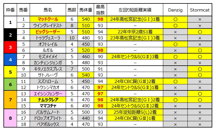 速い時計で決着する場合、加齢と共にスピード能力を喪失していくため、若駒(6歳馬まで)が有利。血統的にはDanzig~Danehillや、Stormcatといったスピードに優れた血が入っていることが大事。また、中京芝1200mは単なるスピードでは勝てず、タフさを求められるためスピードの持続力が必要。ということは馬体重は重ければ重いほどいいことになる。