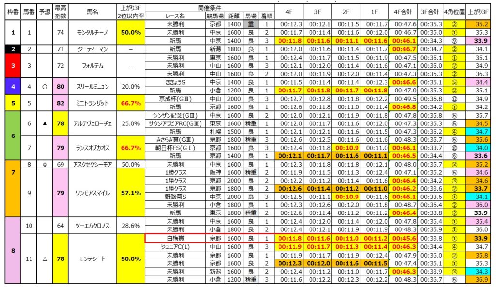 相手は指数が高く内枠で位置を取りに行ける④スリールミニョンと人気の⑥アルテヴェローチェ、白梅賞のレースレベルが高かった大外⑪モンテシートまで。