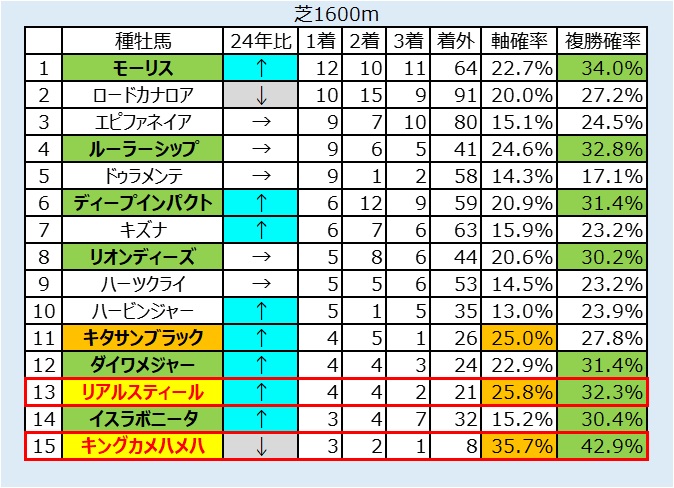 1~5番枠のルーラーシップを狙う。【7,2,2,14】勝率28.0%、連対率36.0%、複勝率44.0%。尚、アタマから狙うなら断然非ノーザンファーム生産馬だ。